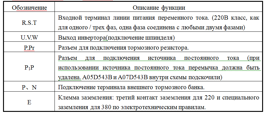 R.S.T Входной терминал линии питания переменного тока. (220В класс, как для одного / трех фаз, одна фаза соединена с любыми двумя фазами)