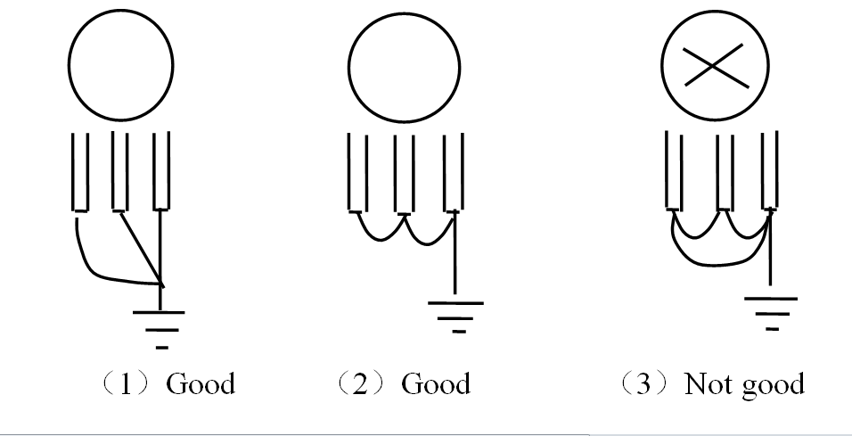  Способ заземления для нескольких преобразователей вместе должно быть сделано, как первый и второй схемах ниже. Избегайте третьего контура.